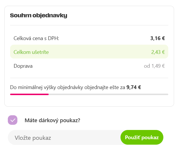 V košíku nájdite políčko „Máte dárkovýpoukaz?“ a vložte tam svoj zľavový kód (pomocou klávesovej skratky CTRL+V) a potvrďte tlačidlom „Použiť poukaz.“