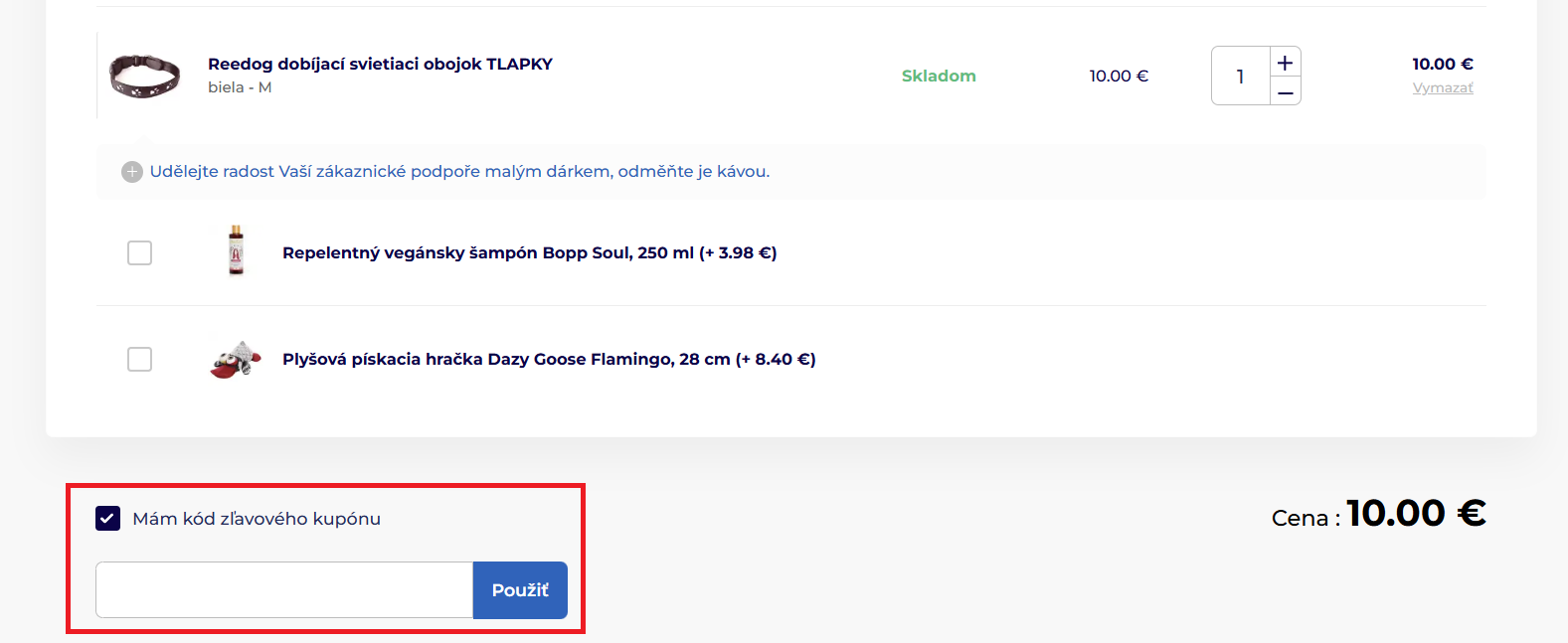 V e-shope si vyberte produkty, ktoré si chcete kúpiť a vložte ich do košíka. V košíku nájdite políčko „Mám kód zľavového kupónu“ na zadanie zľavového kódu. Tam vložte kód z Tipli a kliknite na „Použiť“. Teraz už stačí dokončiť objednávku a máte hotovo. Môžete čakať balíček.