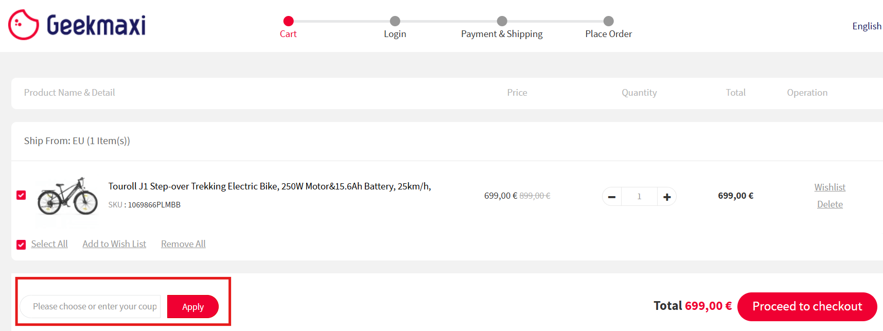 Do políčka „Please choose or enter your coupon“ vložte kupón, kliknite na „Apply“ a máte hotovo.