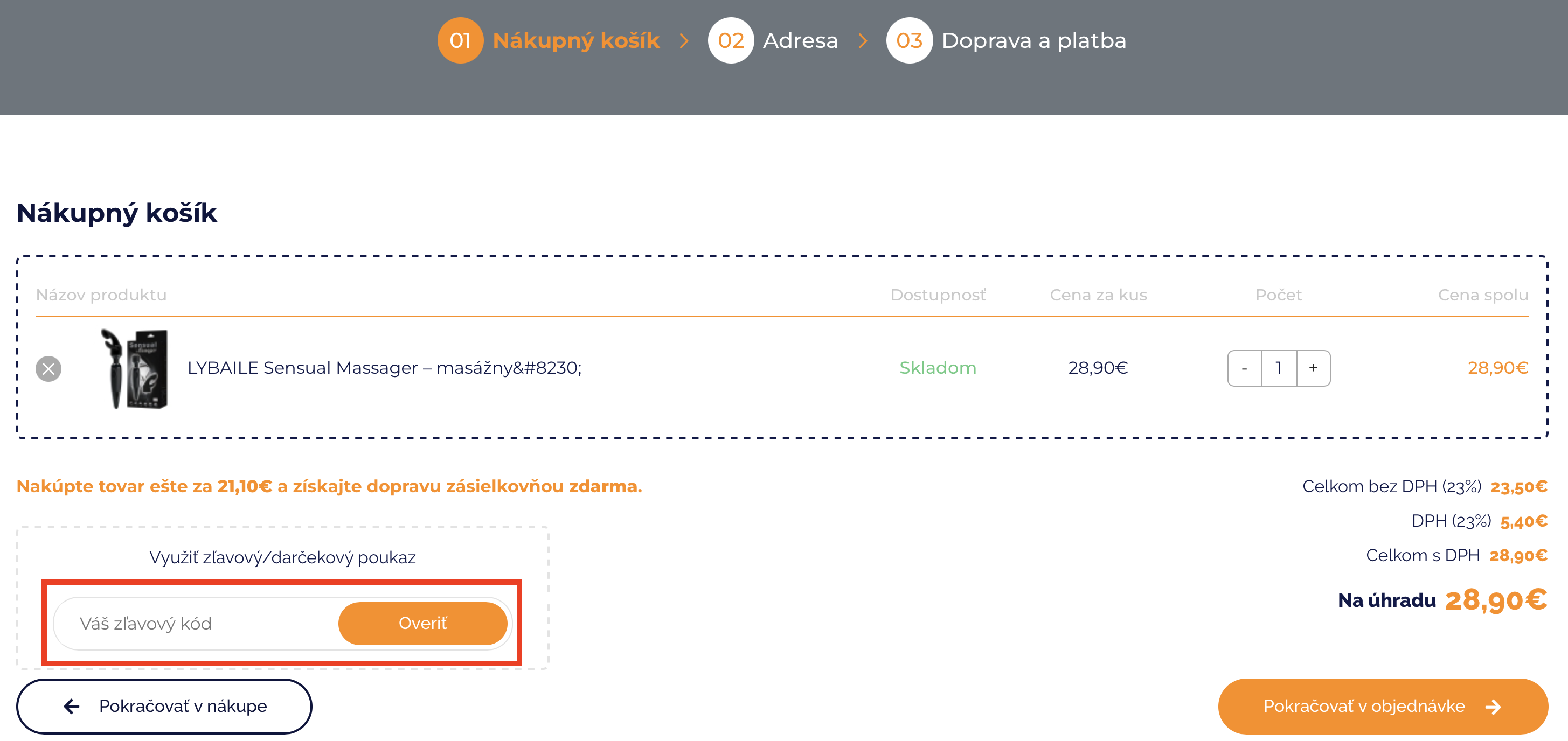 Do políčka „Váš zľavový kód“ skopírujte ten váš kupón (napríklad jednoduchým stlačením klávesovej skratky CTRL-V) a kliknite na „Overiť“.