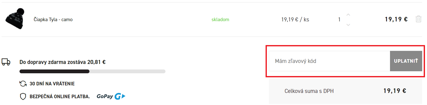 V e-shope si vyberte produkty, ktoré si chcete kúpiť a vložte ich do košíka. V košíku nájdite políčko „Mám zľavový kód“ na zadanie zľavového kódu. Tam vložte kód z Tipli a kliknite na „Uplatniť“. Teraz už stačí dokončiť objednávku a máte hotovo. Môžete čakať balíček.