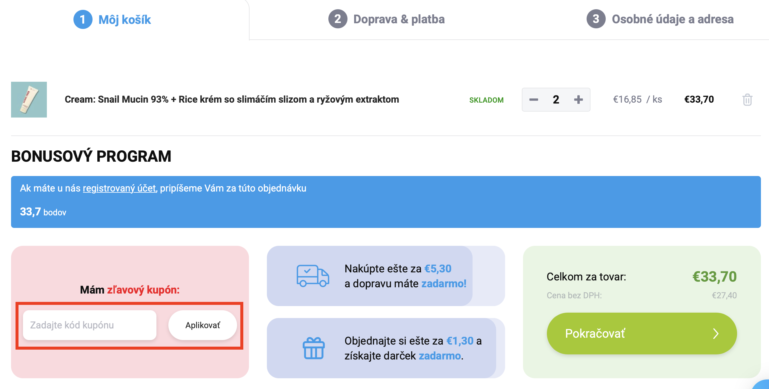Do políčka „Mám zľavový kupón“ skopírujte ten váš (napríklad jednoduchým stlačením klávesovej skratky CTRL-V) a kliknite na „Aplikovať“.