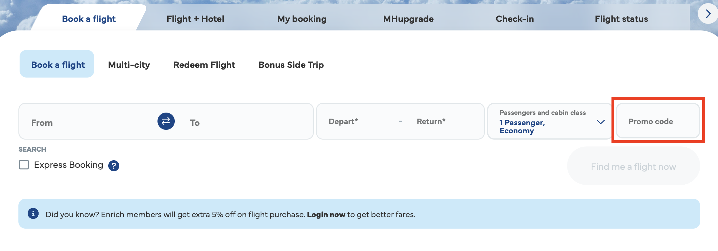 Zadajte cieľ cesty, dátum letu a ďalšie potrebné údaje na vyhľadávanie. Na rovnakom mieste nájdete políčko "Promo Code". Do tohto poľa vložte získaný kód, kliknite na tlačidlo "Find me a flight now" a dokončite rezerváciu. Ak ste zadali platný kód a spĺňate podmienky kupónu, zľava sa automaticky odpočíta z celkovej sumy na zaplatenie.