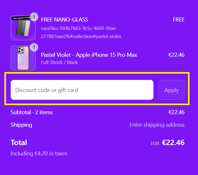 V e-shope si vyberte produkty, ktoré si chcete kúpiť a vložte ich do košíka. V košíku nájdite políčko „Discount code or gift card“ na zadanie zľavového kódu. Tam vložte kód z Tipli a kliknite na „Apply“. Teraz už stačí dokončiť objednávku a máte hotovo. Môžete čakať balíček.