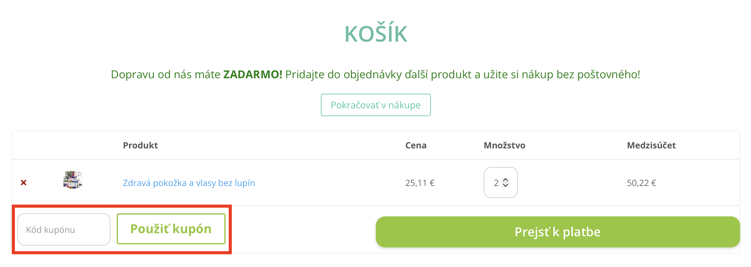 Do políčka „Kód kupónu“ skopírujte váš zľavový kód (napríklad jednoduchým stlačením klávesovej skratky CTRL-V) a kliknite na „Použiť kupón“.
