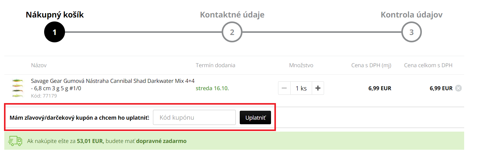 Do políčka „Mám zľavový/darčekový kupón a chcem ho uplatniť:“ vložte kupón, kliknite na „Uplatniť“ a máte hotovo.