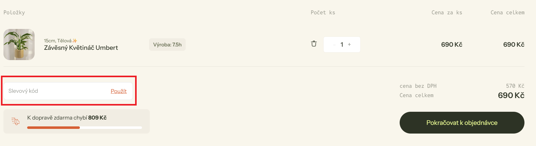 V e-shope si vyberte produkty, ktoré si chcete kúpiť a vložte ich do košíka. V košíku nájdite políčko „Slevový kód“ na zadanie zľavového kódu. Tam vložte kód z Tipli a kliknite na „Použít“. Teraz už stačí dokončiť objednávku a máte hotovo. Môžete čakať balíček.