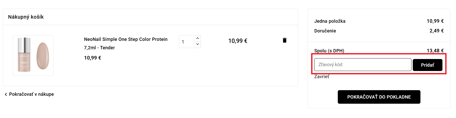 V e-shope si vyberte produkty, ktoré si chcete kúpiť a vložte ich do košíka. V košíku nájdite políčko „Zľavový kód“ na zadanie zľavového kódu. Tam vložte kód z Tipli a kliknite na „Pridať“. Teraz už stačí dokončiť objednávku a máte hotovo. Môžete čakať balíček.