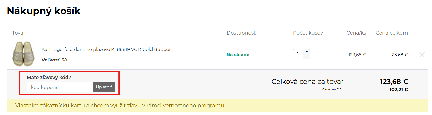 Do políčka „Máte zľavový kód?“ vložte kupón, kliknite na „Uplatniť“ a máte hotovo.