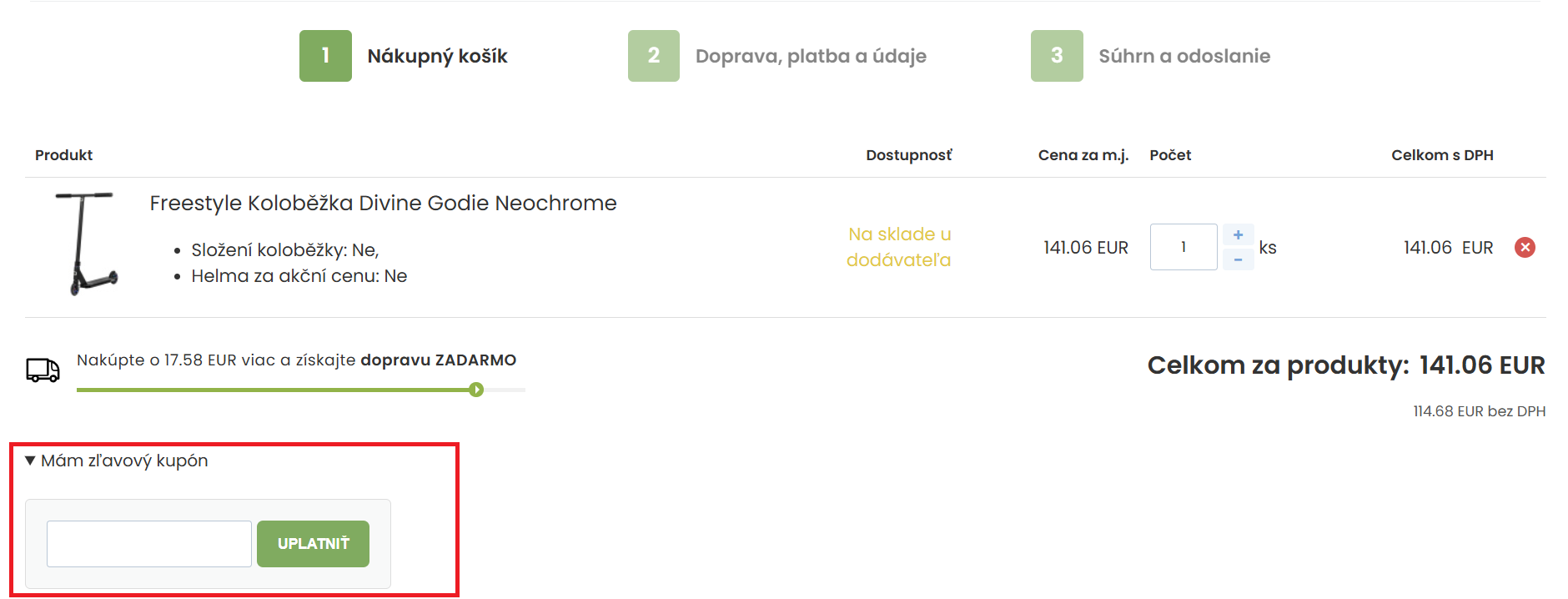 V e-shope si vyberte produkty, ktoré si chcete kúpiť a vložte ich do košíka. V košíku nájdite políčko „Mám zľavový kód“ na zadanie zľavového kódu. Tam vložte kód z Tipli a kliknite na „Uplatniť“.