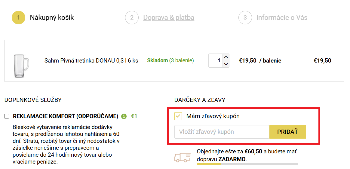 V e-shope si vyberte produkty, ktoré si chcete kúpiť a vložte ich do košíka. V košíku nájdite políčko „Vložiť zľavový kupón“ na zadanie zľavového kódu. Tam vložte kód z Tipli a kliknite na „Pridať“. Teraz už stačí dokončiť objednávku a máte hotovo. Môžete čakať balíček.