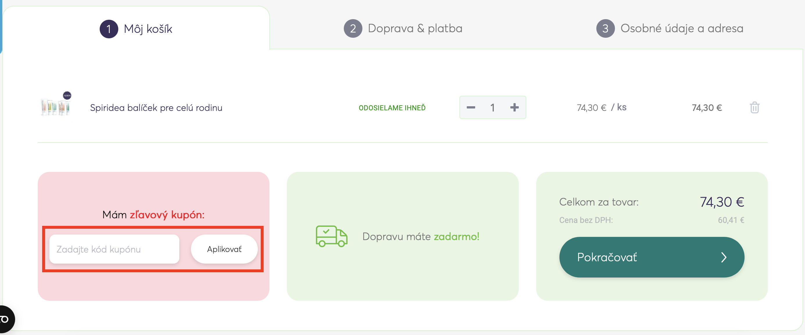 Do políčka „Zadajte kód kupónu“ vložte váš zľavový kód (napríklad jednoduchým stlačením klávesovej skratky CTRL-V) a kliknite na „Aplikovať“.