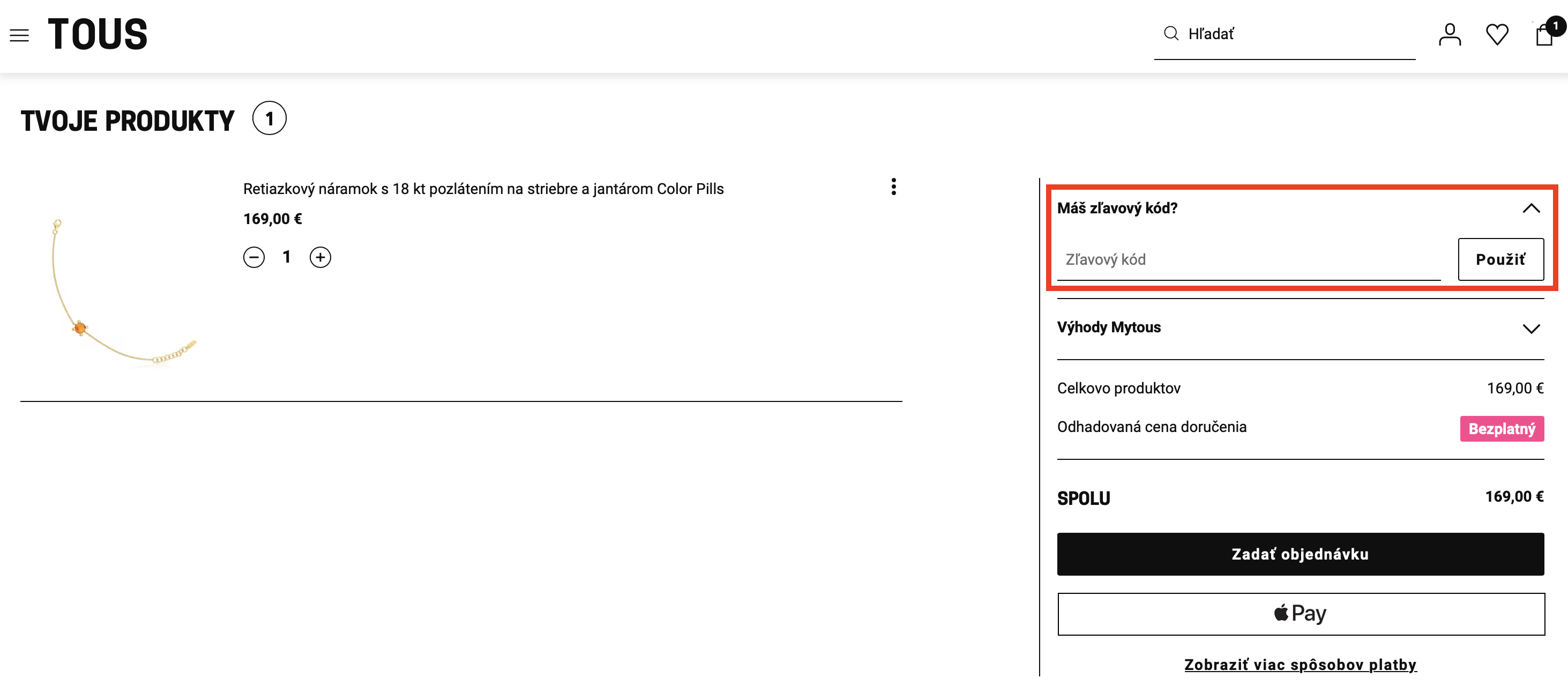 Do políčka „Máš zľavový kód?“ skopírujte váš kód TOUS a kliknite na tlačidlo „Použiť“. Dokončite nákup.