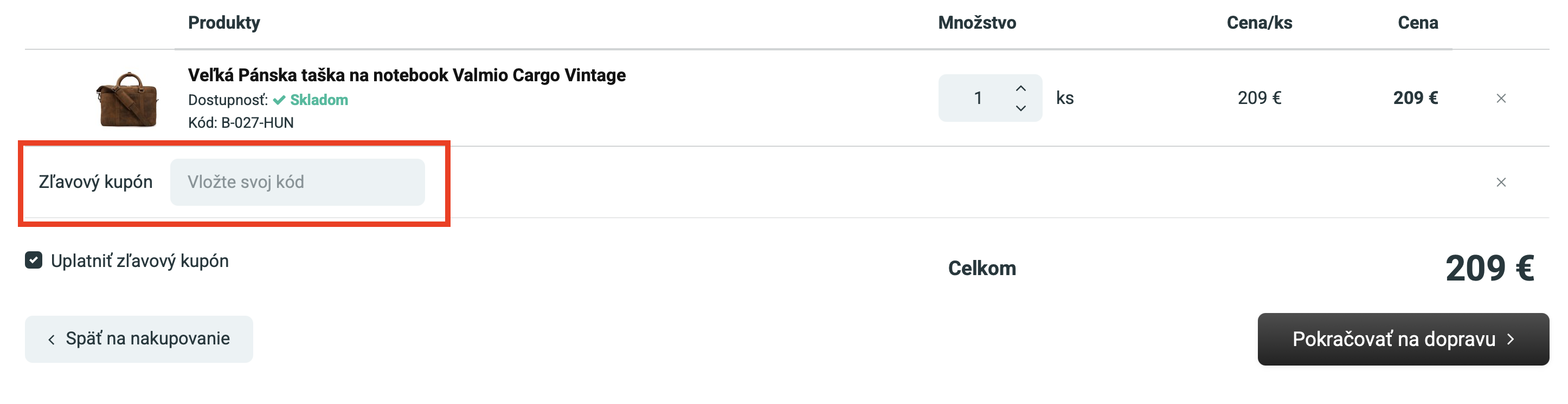 Do políčka „Vložte svoj kód“ skopírujte váš zľavový kupón (napríklad jednoduchým stlačením klávesovej skratky CTRL-V) a kód sa automaticky aktivuje. Dokončite nákup.