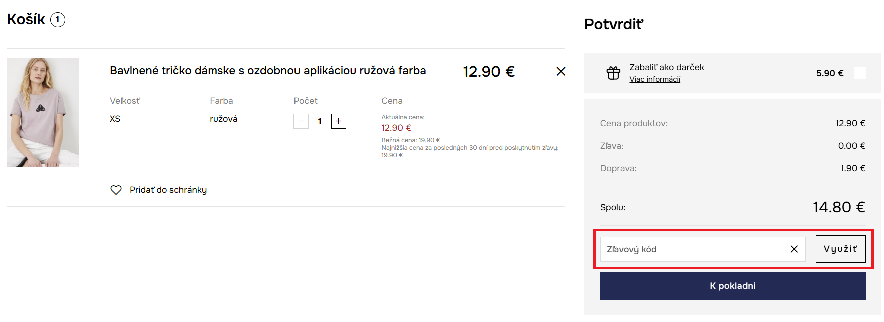 V e-shope si vyberte produkty, ktoré si chcete kúpiť a vložte ich do košíka. V košíku nájdite políčko „Zľavový kód“ na zadanie zľavového kódu. Tam vložte kód z Tipli a kliknite na „Využiť“. Teraz už stačí dokončiť objednávku a máte hotovo. Môžete čakať balíček.