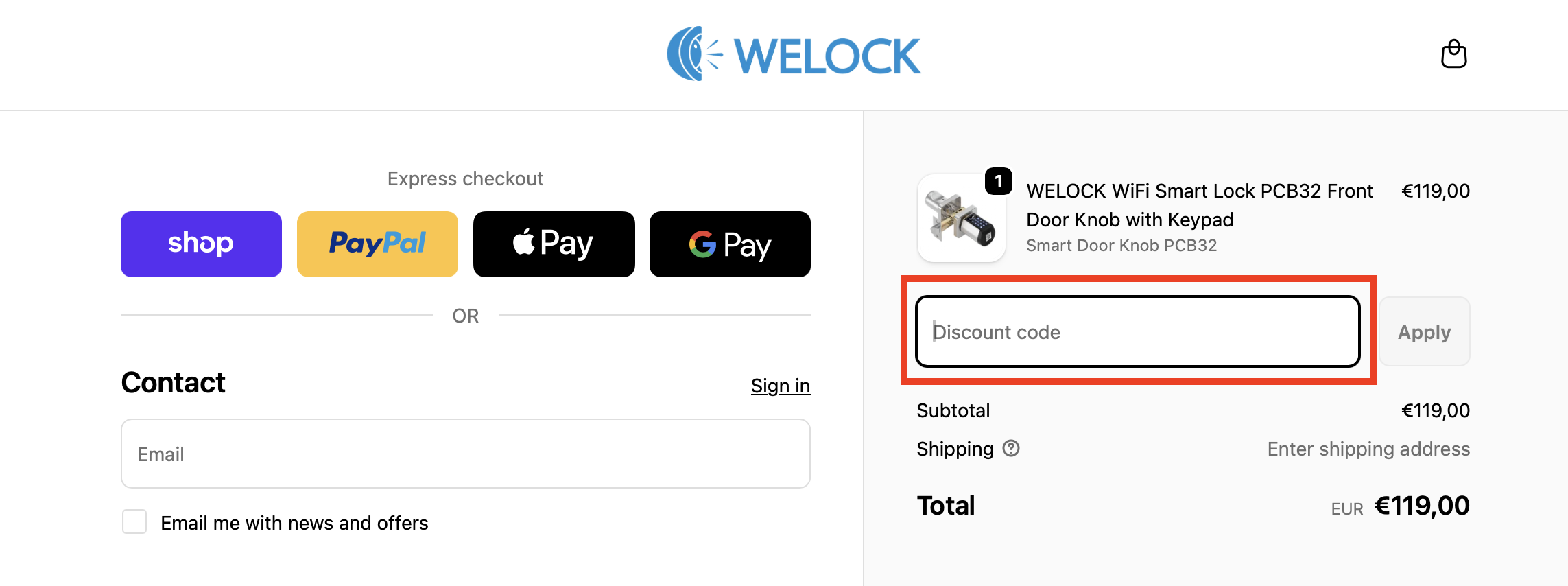 Do políčka „Discount code“ skopírujte váš WELOCK zľavový kód a kliknite na tlačidlo „Apply“. Dokončite nákup.