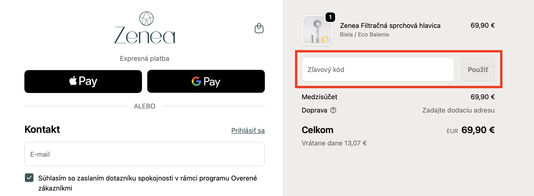 Do políčka „Zľavový kód“ vložte Zenea kupón, kliknite na „Použiť“ a máte hotovo.