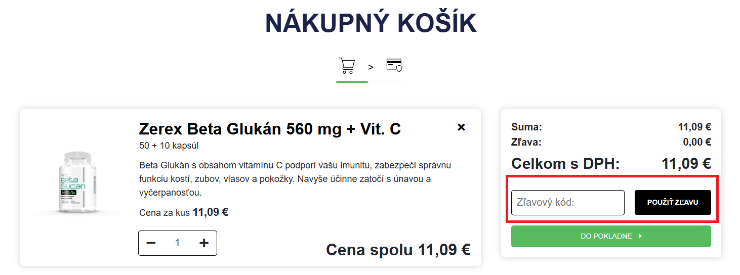 V e-shope si vyberte produkty, ktoré si chcete kúpiť a vložte ich do košíka. V košíku nájdite políčko „Zľavový kód“ na zadanie zľavového kódu. Tam vložte kód z Tipli a kliknite na „Použiť zľavu“. Teraz už stačí dokončiť objednávku a máte hotovo. Môžete čakať balíček.