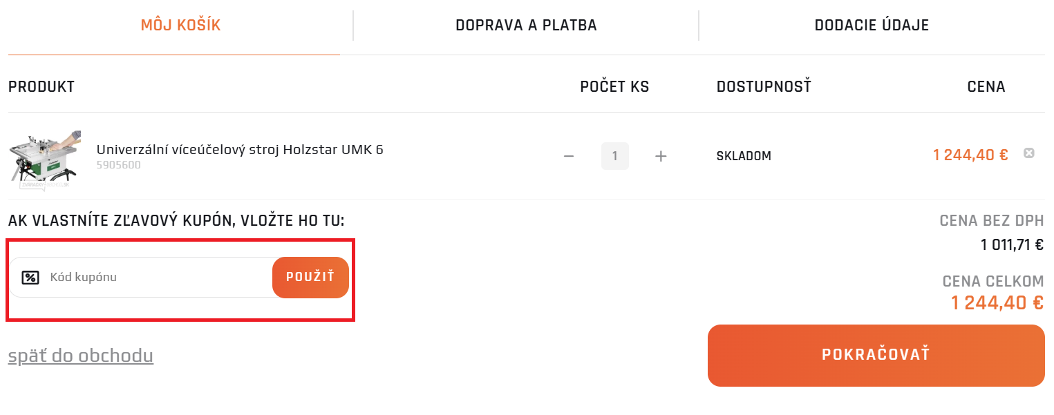 V e-shope si vyberte produkty, ktoré si chcete kúpiť, a vložte ich do košíka. V košíku nájdite políčko „Kód kupónu“ na zadanie zľavového kódu. Tam vložte kód z Tipli a kliknite na „Použiť“.
